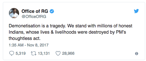 NDTV: On demonetisation anniversary today, Congress Vice President Rahul Gandhi will participate in a candle-light vigil in Gujarat's Surat as part of the opposition parties' "Black Day" protest. His visit is also significant as the state will go for assembly elections next month.