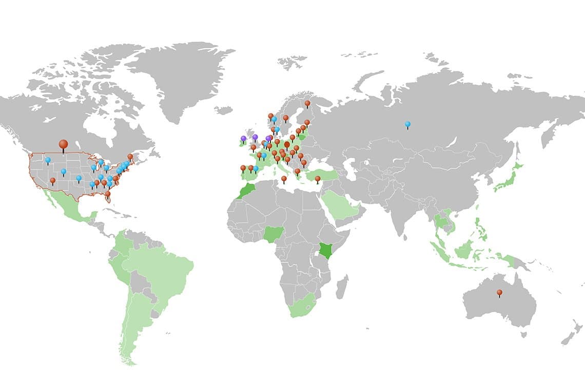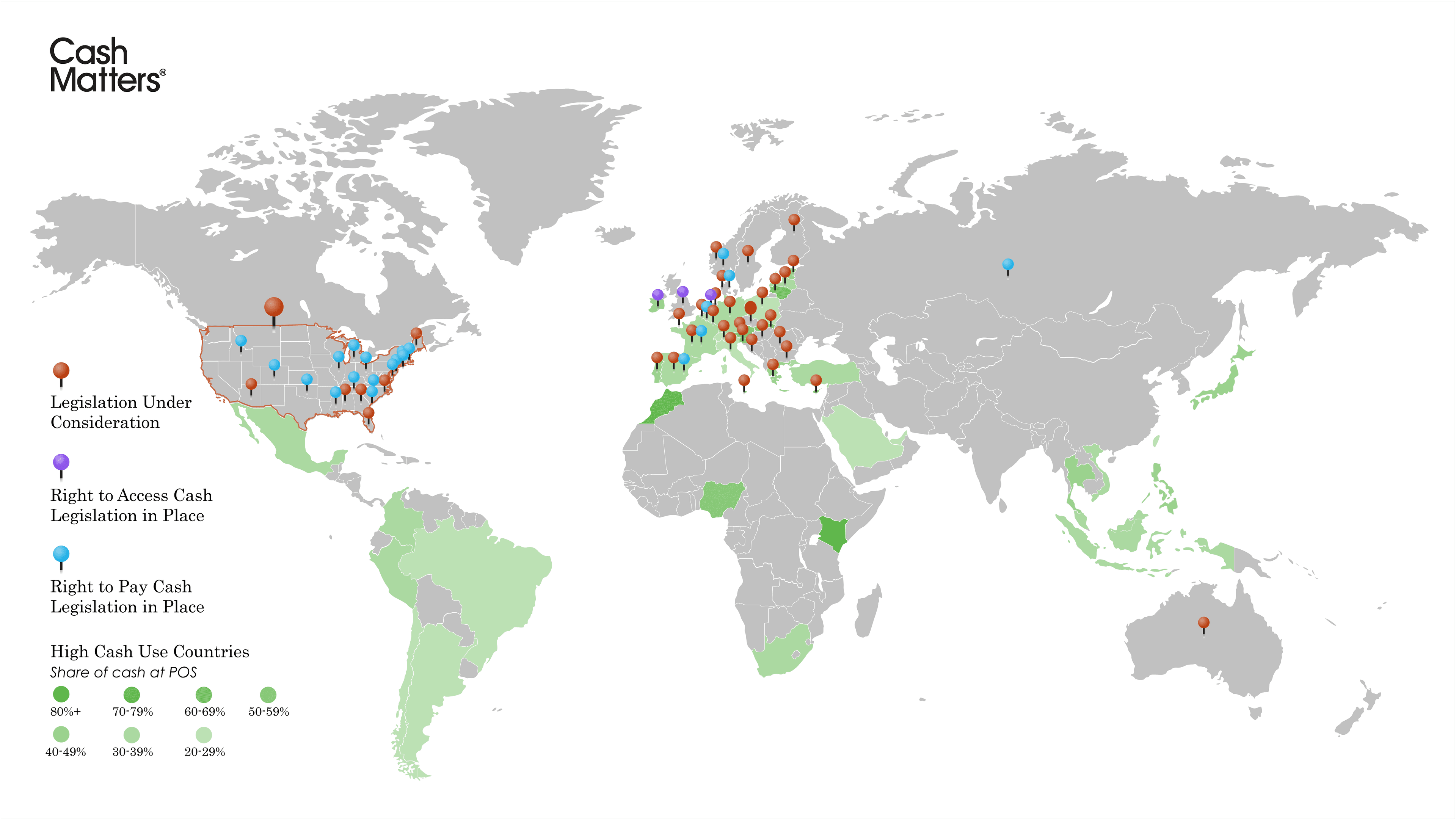 The map below is a snapshot of legislative status and intensity of cash use, captured in October 2024. Red pins show places where new laws—either governing access to or acceptance of cash—is (or was) under consideration by national authorities. One large pin in the United States represents a bipartisan bill that would require brick and mortar businesses nationwide to accept cash. Other pins show the legislative situation in individual states and major cities.