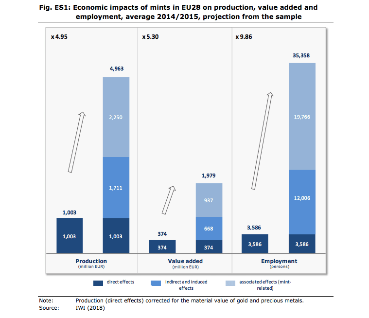 - Summing up all mint-and coin related effects, we can conclude that a total of €13,797 million of production and employment for 169,858 persons in the EU28 are generated by the macroeconomic and associated effects of mints of by the effects associated with the existence of coins in the economy.