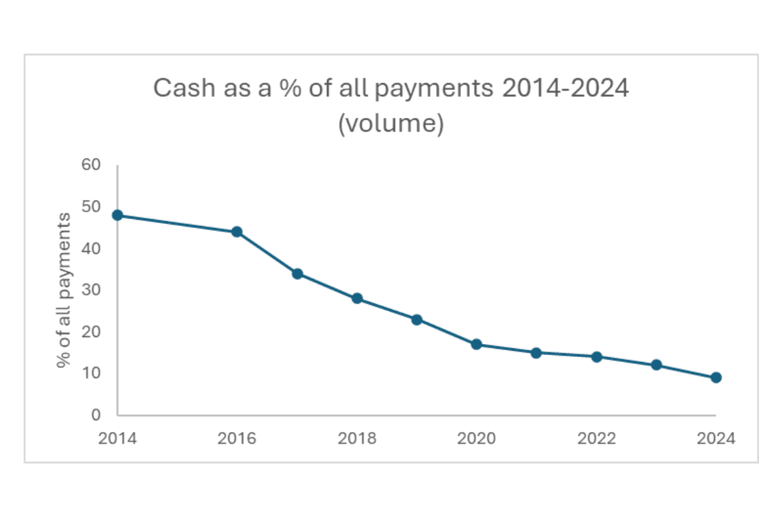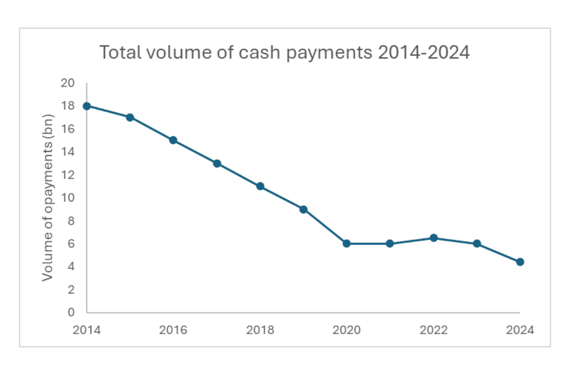 The headline finding from this year’s report informs us that in 2024 cash payments accounted for 4.4 billion payments, 9% of the total volume. It notes that cash payments have been declining over the past two decades (see chart below) and 2024 marks a new threshold as cash for the first time amounted for less than 10% of all payments ending its role as the second most used payment method in the UK, falling behind Direct Debits, Faster Payments and credit cards.