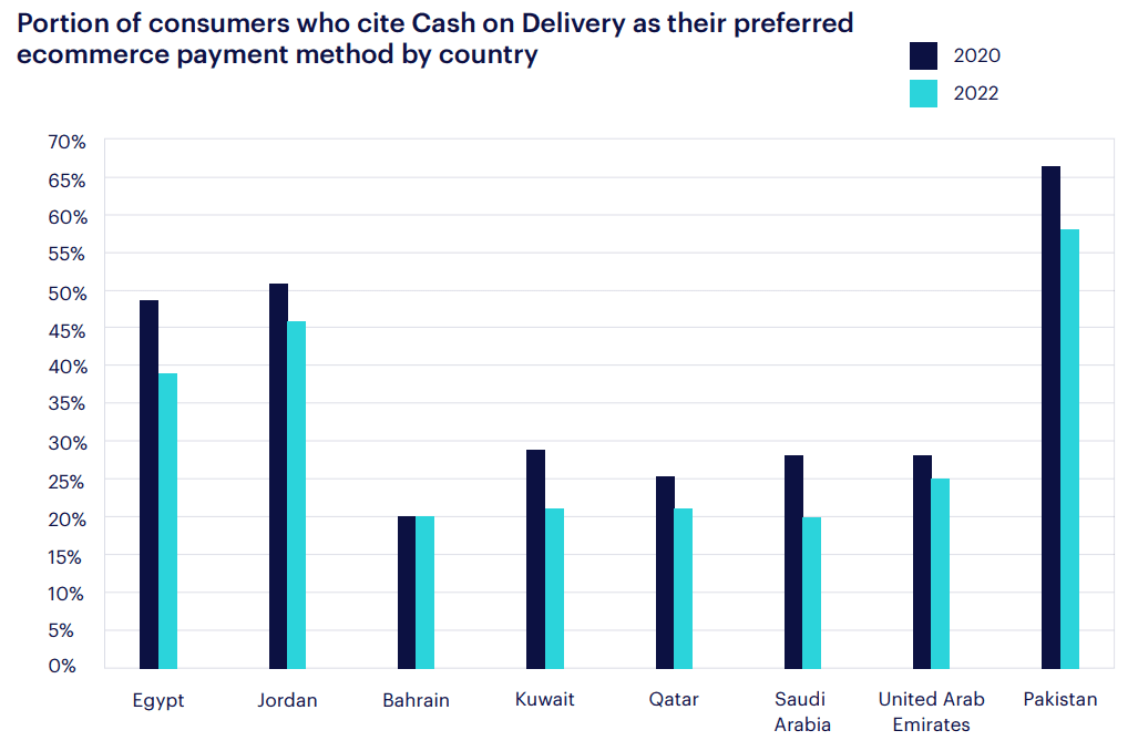 While the use of cash on delivery has declined in most nations—though notably not in Bahrain, which continues to use it for around 20 percent of transactions—it remains popular across MENA, most especially in Pakistan, Egypt and Jordan.