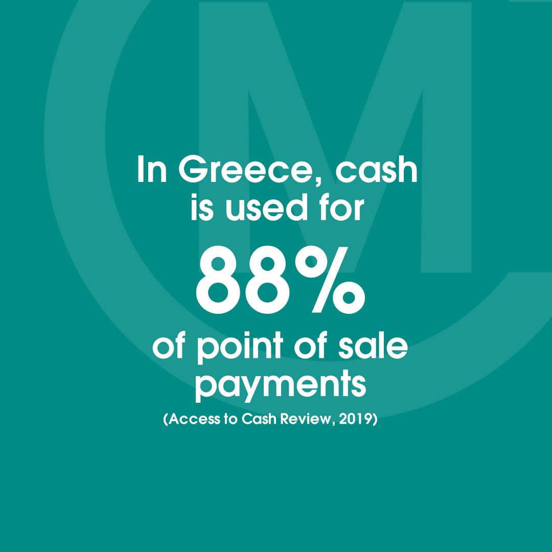 In Greece, 88% of point of sale payments happen with cash (Access to Cash Review, 2019)