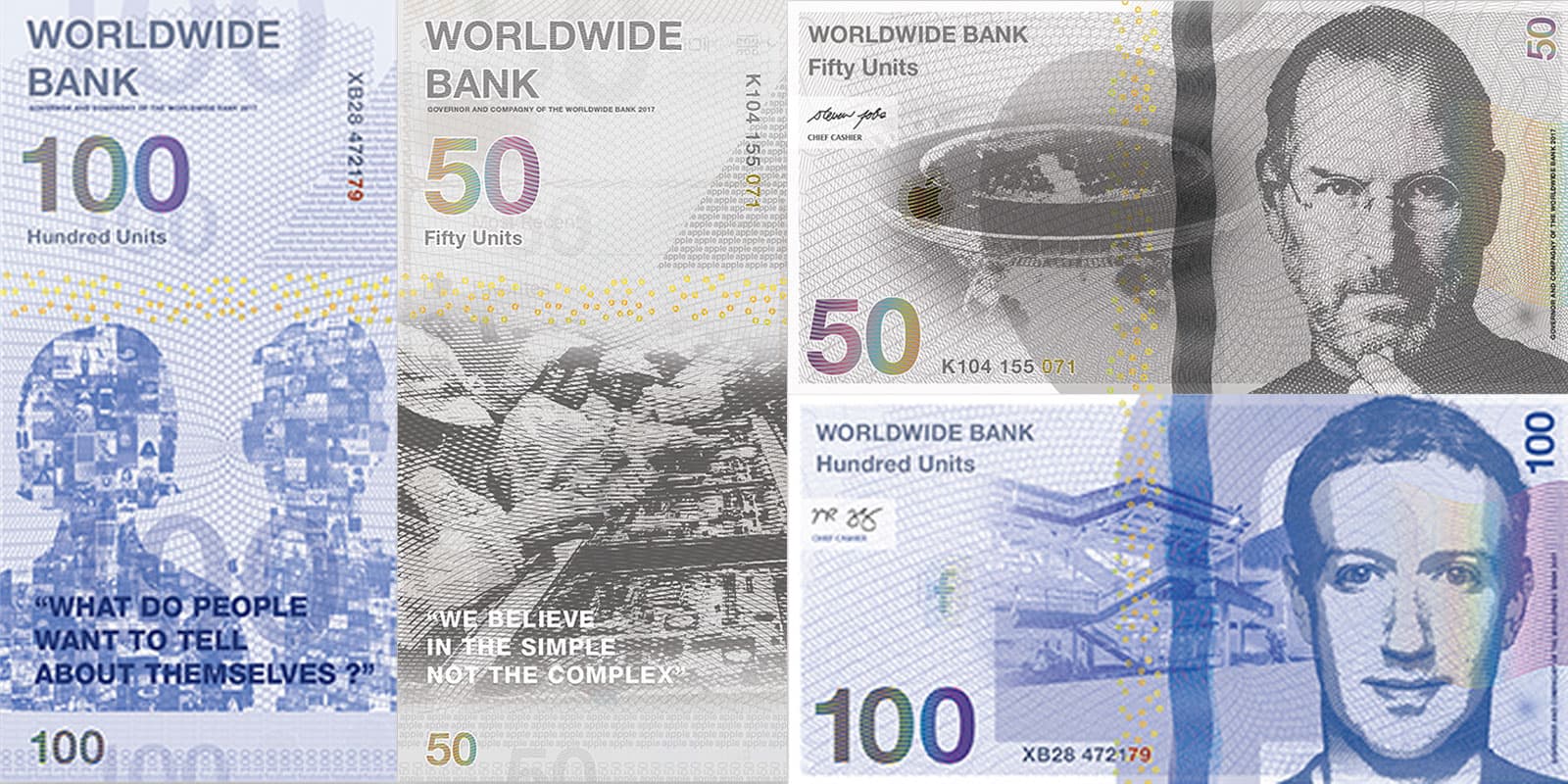 The pseudo corporate banknotes are not only embossed with respective company logos but they also feature the founding faces behind the giant companies, mission statements and anti-counterfeiting details.